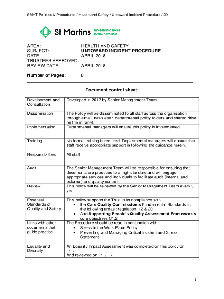SMH Policies & Procedures / Health and Safety / Untoward Incident Procedure / 20AREA: SUBJECT: DATE: TRUSTEES APPROVED: REVIEW DATE:HEALTH AND SAFETY UNTOWARD INCIDENT PROCEDURE APRIL 2018 APRIL 2018Number