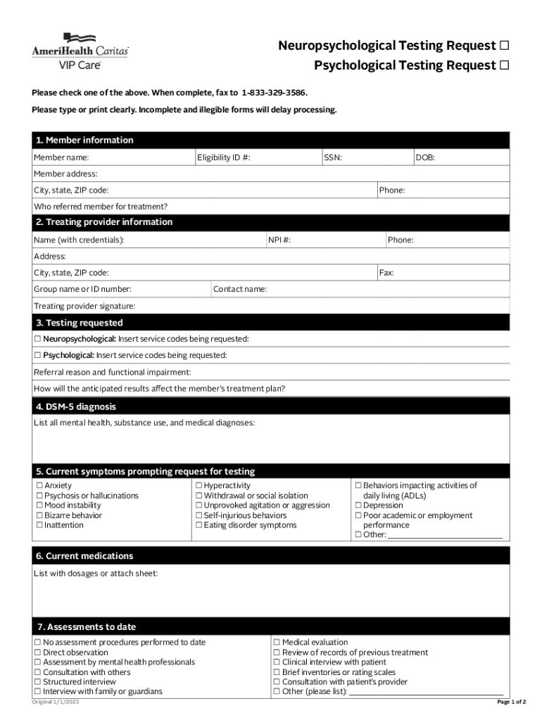 Get the free Neuropsychological/Psychological Testing Request - AmeriHealth Caritas VIP Care. Neu...