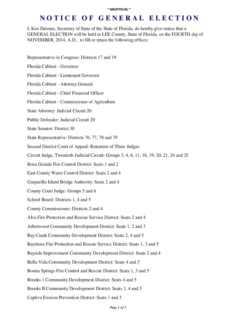 **UNOFFICIAL**NOTICE OF GENERAL ELECTION I, Ken Deter, Secretary of State of the State of Florida, do hereby give notice that a GENERAL ELECTION will be held in Lee County, State of Florida, on the
