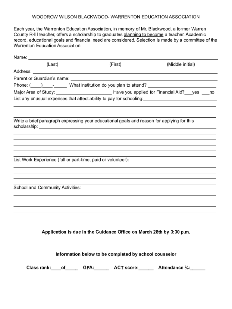 WOODROW WILSON BLACKWOOD TARKENTON EDUCATION ASSOCIATION Each year, the Warren ton Education Association, in memory of Mr. Blackwood, a former Warren County III teacher, offers a scholarship to graduates