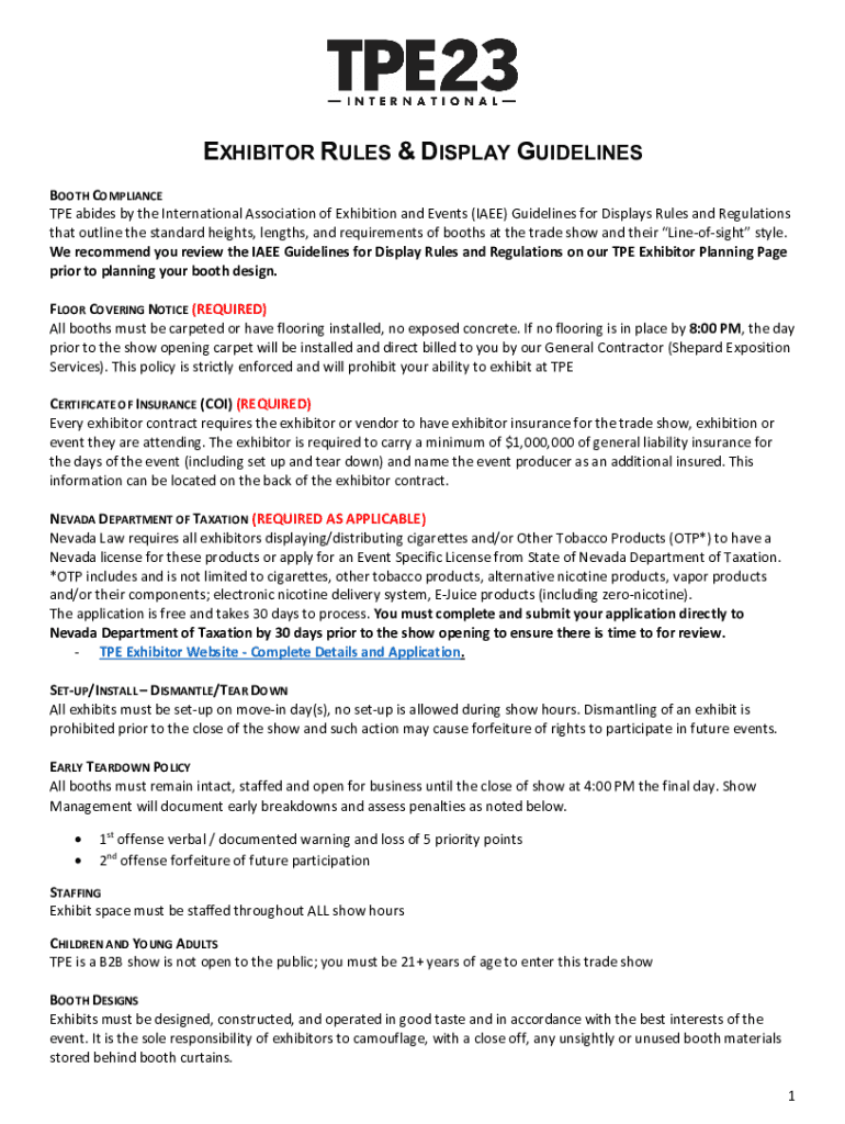 EXHIBITOR RULES & DISPLAY GUIDELINES BOOTH COMPLIANCE TPE abides by the International Association of Exhibition and Events (IEEE) Guidelines for Displays Rules and Regulations that outline the standard