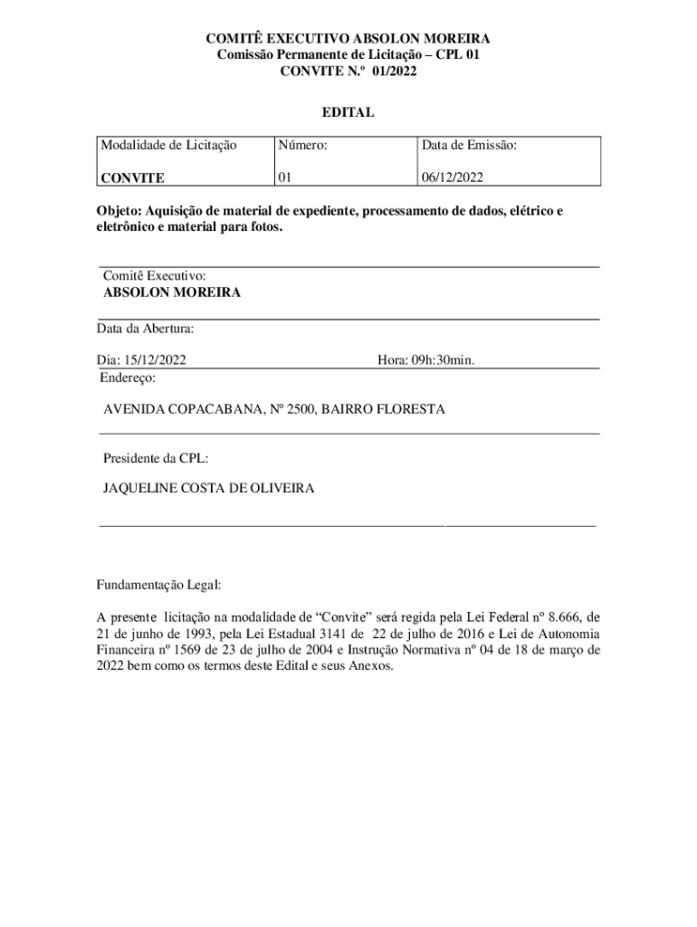 Modalidade de LicitaoNmero:Data de Emisso:CONVITE0106/12/2022Objeto: Aquino de material DE expedient,
