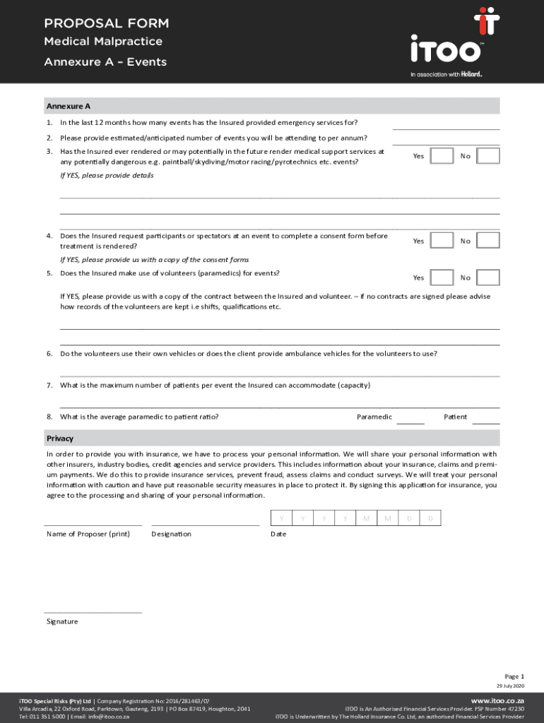 PROPOSAL FORM Medical Malpractice Appendix A EventsAnnexure A 1. In the last 12 months how many events has the Insured provided emergency services for? 2. Please provide estimated/anticipated number