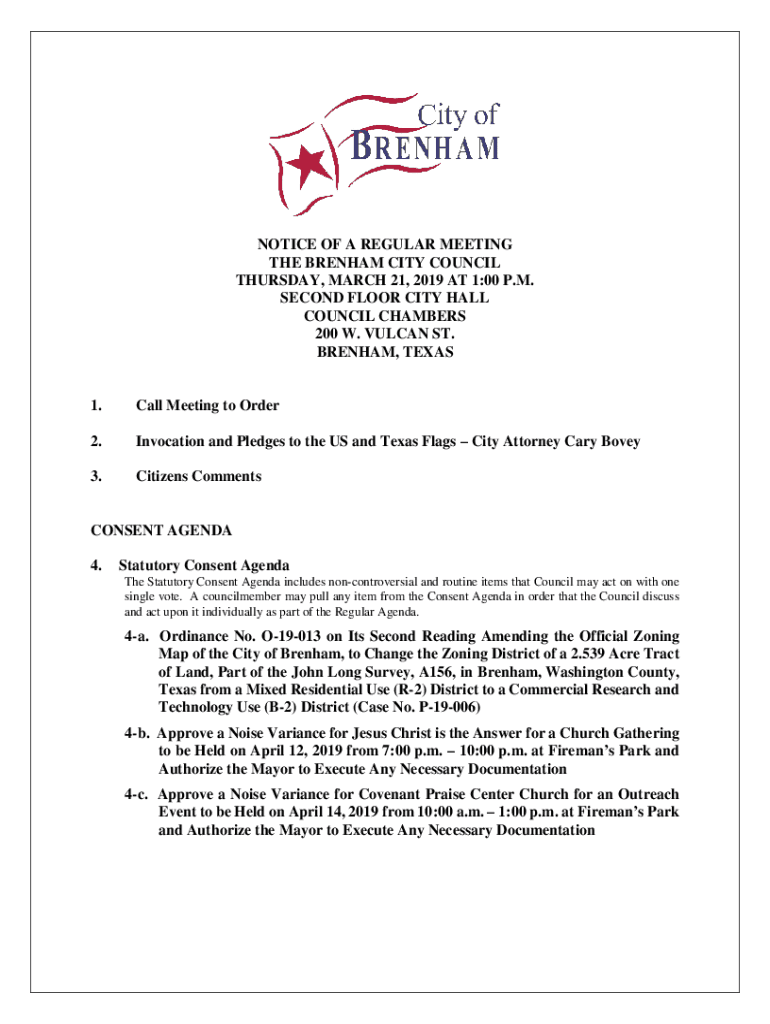 NOTICE OF A REGULAR MEETING THE BRENDAN CITY COUNCIL THURSDAY, MARCH 21, 2019, AT 1:00 P.M. SECOND FLOOR CITY HALL COUNCIL CHAMBERS 200 W. VULCAN ST. BRENDAN, TEXAS1. Call Meeting to Order2. Invocation