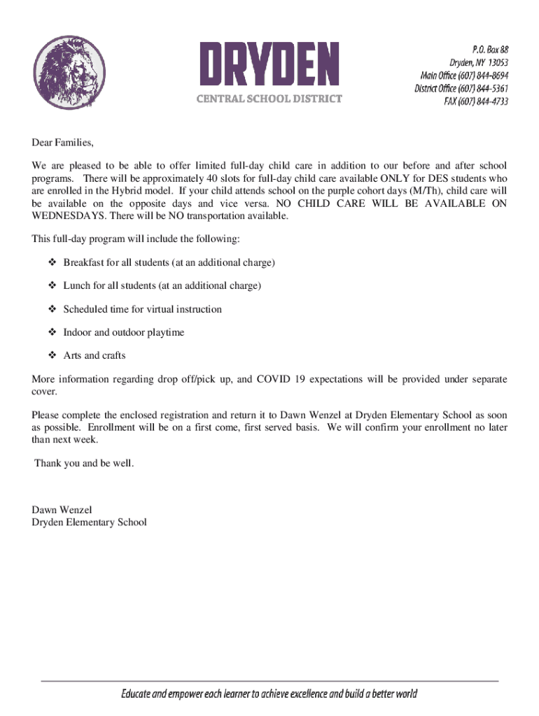 Dear Families, We are pleased to be able to offer limited full day child care in addition to our before and after school programs. There will be approximately 40 slots for full day child care available