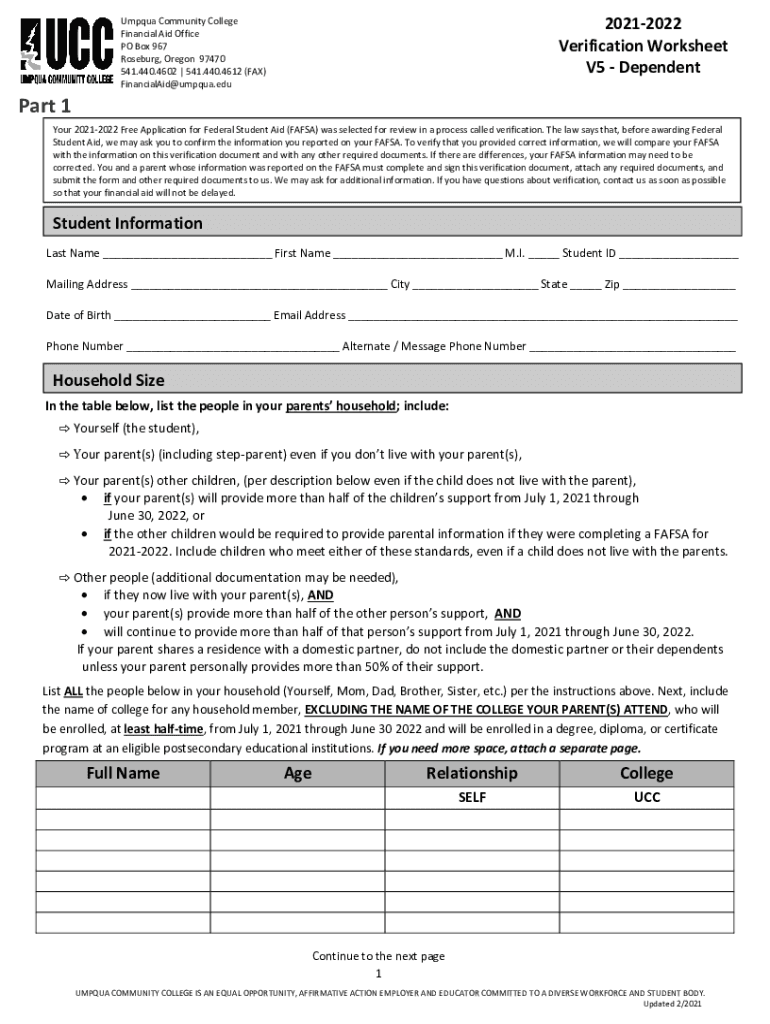 Part 120212022 Verification Worksheet V5 DependentUmpqua Community College Financial Aid Office PO Box 967 Roseburg, Oregon 97470 541.440.4602 | 541.440.4612 (FAX) FinancialAid@umpqua.eduYour 20212022