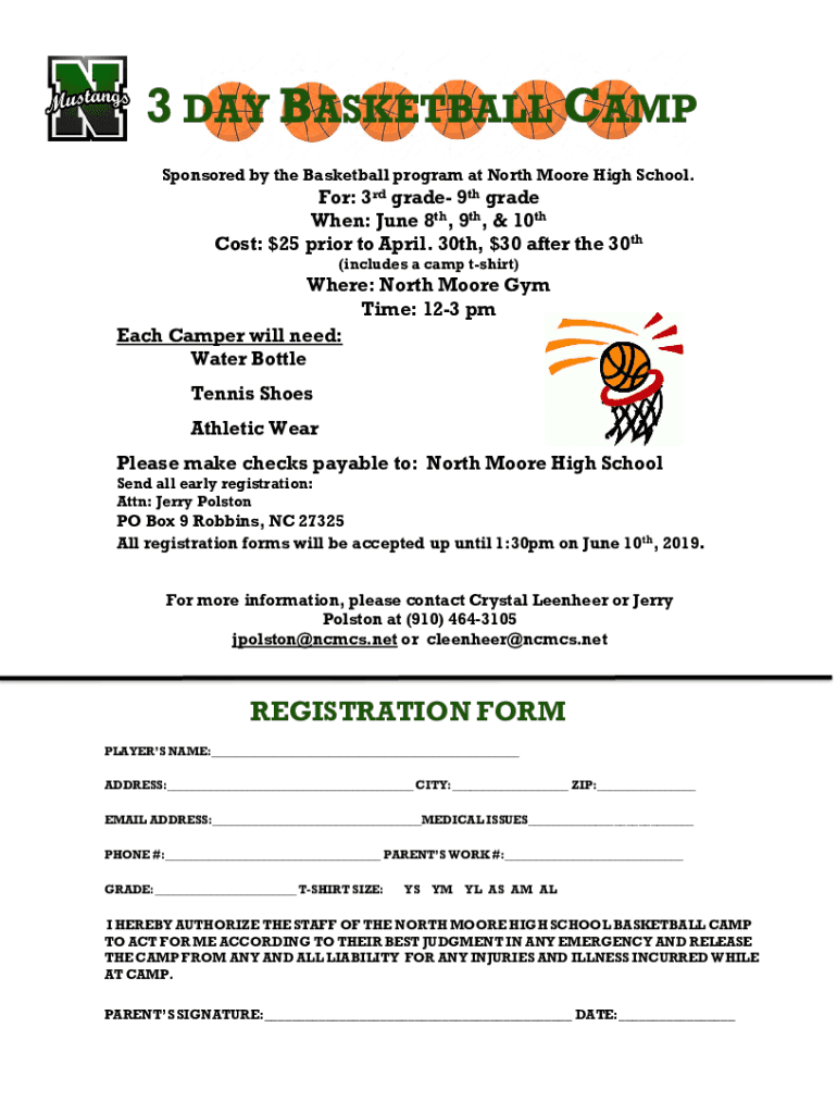 3 DAY BASKETBALL CAMP Sponsored by the Basketball program at North Moore High School. For: 3rd grade 9th grade When: June 8th, 9th, & 10th Cost: $25 prior to April. 30th, $30 after the 30th (includes