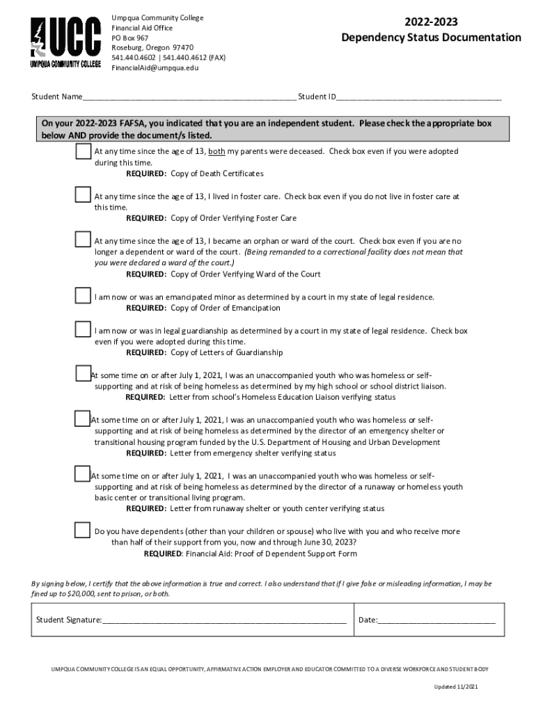 Ump qua Community College Financial Aid Office PO Box 967 Roseburg, Oregon 97470 541.440.4602 | 541.440.4612 (FAX) FinancialAid@umpqua.edu20222023 Dependency Status DocumentationStudent Name___ Student