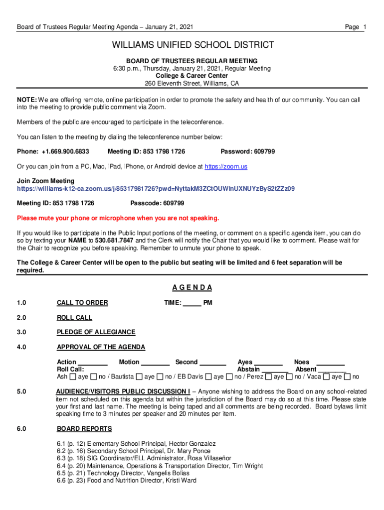Board of Trustees Regular Meeting Agenda January 21, 2021Page 1WILLIAMS UNIFIED SCHOOL DISTRICT BOARD OF TRUSTEES REGULAR MEETING 6:30 p.m., Thursday, January 21, 2021, Regular Meeting College & Career