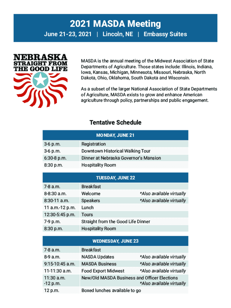 2021 MAZDA Meeting June 2123, 2021 | Lincoln, NE | Embassy SuitesMASDA is the annual meeting of the Midwest Association of State Departments of Agriculture. Those states include: Illinois, Indiana,
