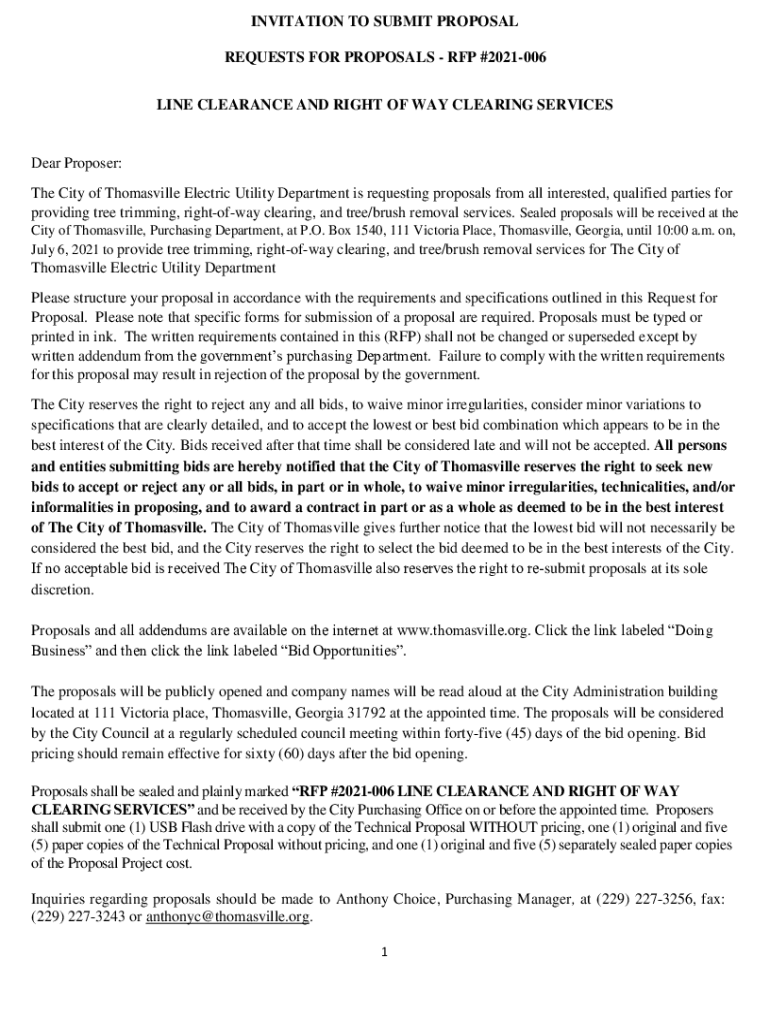 INVITATION TO SUBMIT PROPOSAL REQUESTS FOR PROPOSALS RFP #2021006 LINE CLEARANCE AND RIGHT OF WAY CLEARING SERVICESDear Proposer: The City of Thomasville Electric Utility Department is requesting