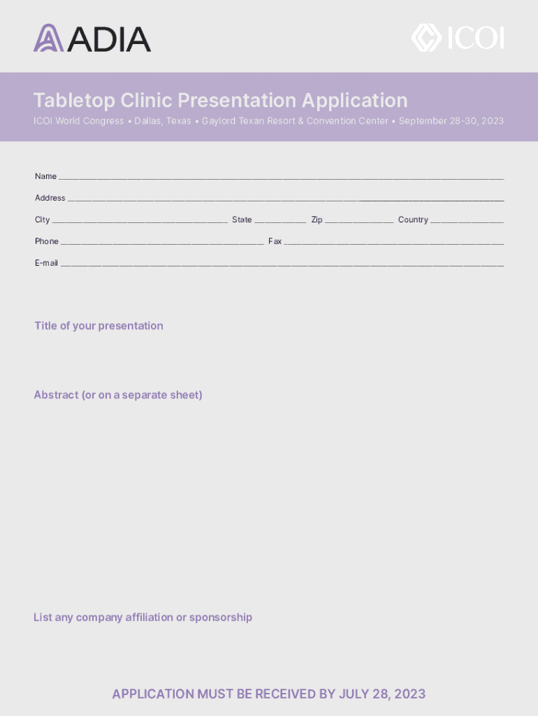 Tabletop Clinic Presentation Application ICON World Congress Dallas, Texas Gaylord Texan Resort & Convention Center September 2830, 2023Name ___ Address ___ City ___ State ___ Zip ___ Country ___