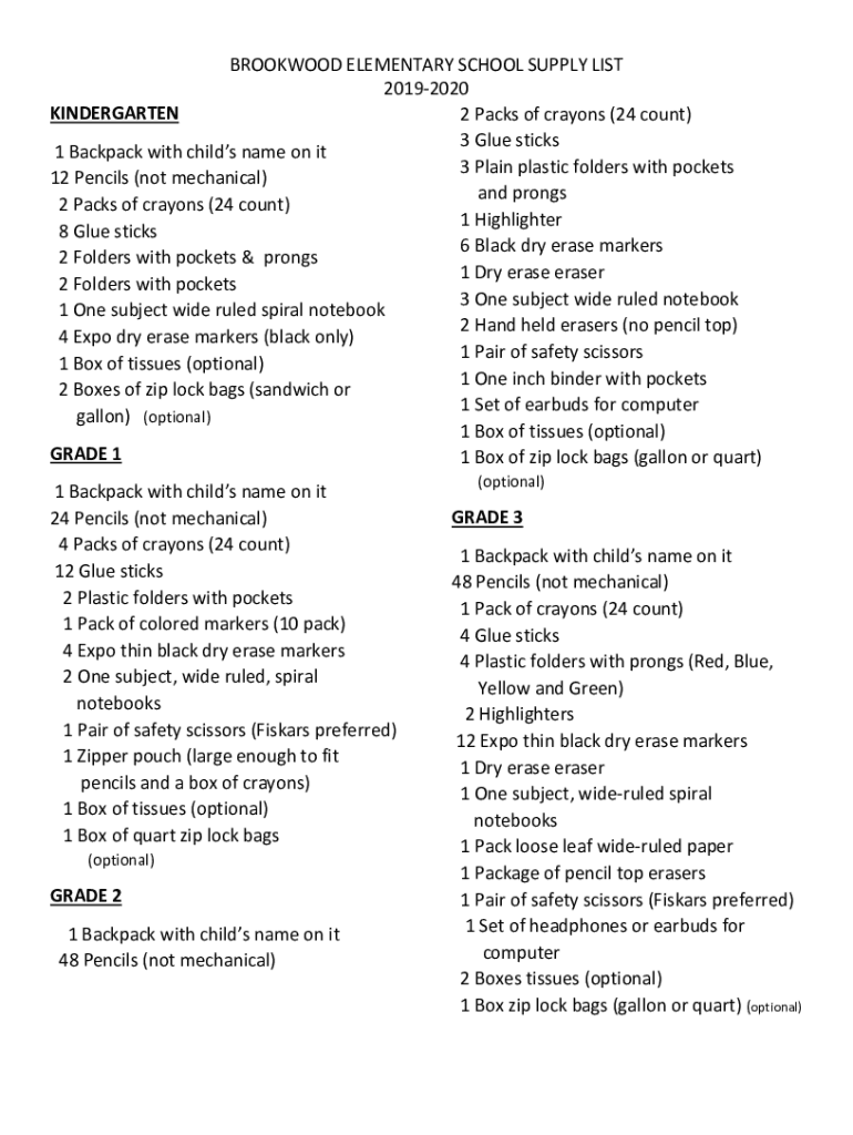 Brookwood elementary school supply refers to the list of required items that students need to bring to school for the academic year.