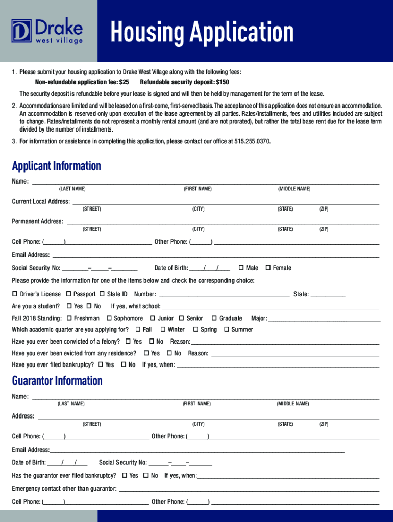 Housing Application 1. Please submit your housing application to Drake West Village along with the following fees: Nonrefundable application fee: $25 Refundable security deposit: $150The security