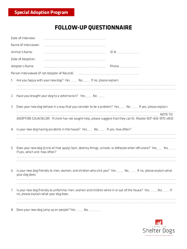 Special Adoption ProgramFOLLOWUP QUESTIONNAIRE Date of Interview:___Name of Interviewer:___Animals Name:___Date of Adoption:___Adopters Name:___Person Interviewed (if not Adopter of Record): 1.ID