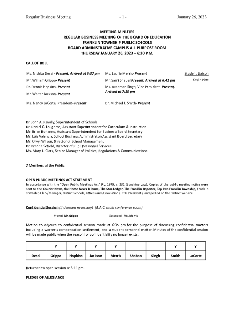 Regular Business Meeting1January 26, 2023MEETING MINUTES REGULAR BUSINESS MEETING OF THE BOARD OF EDUCATION FRANKLIN TOWNSHIP PUBLIC SCHOOLS BOARD ADMINISTRATIVE CAMPUS ALL PURPOSE ROOM THURSDAY,