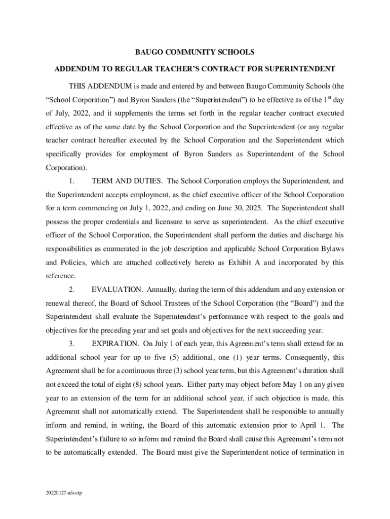 BAU GO COMMUNITY SCHOOLS ADDENDUM TO REGULAR TEACHERS CONTRACT FOR SUPERINTENDENT THIS ADDENDUM is made and entered by and between Bakugo Community Schools (the School Corporation) and Byron Sanders