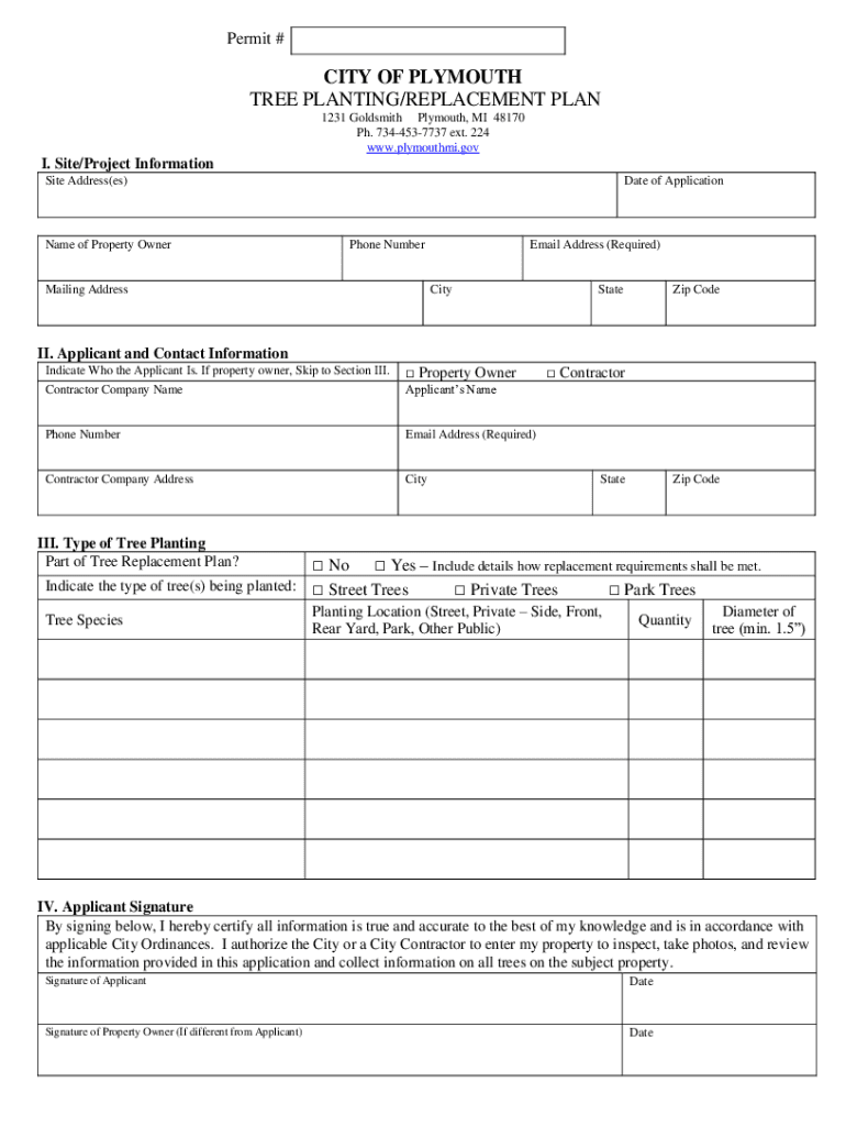 Permit #CITY OF PLYMOUTH TREE PLANTING/REPLACEMENT PLAN 1231 Goldsmith Plymouth, MI 48170 pH. 7344537737 ext. 224 www.plymouthmi.govI. Site/Project Information Site Address(BS)Name of Property Operate
