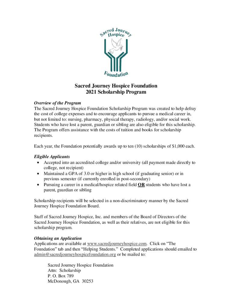 Sacred Journey Hospice Foundation 2021 Scholarship Program Overview of the Program The Sacred Journey Hospice Foundation Scholarship Program was created to help defray the cost of college expenses