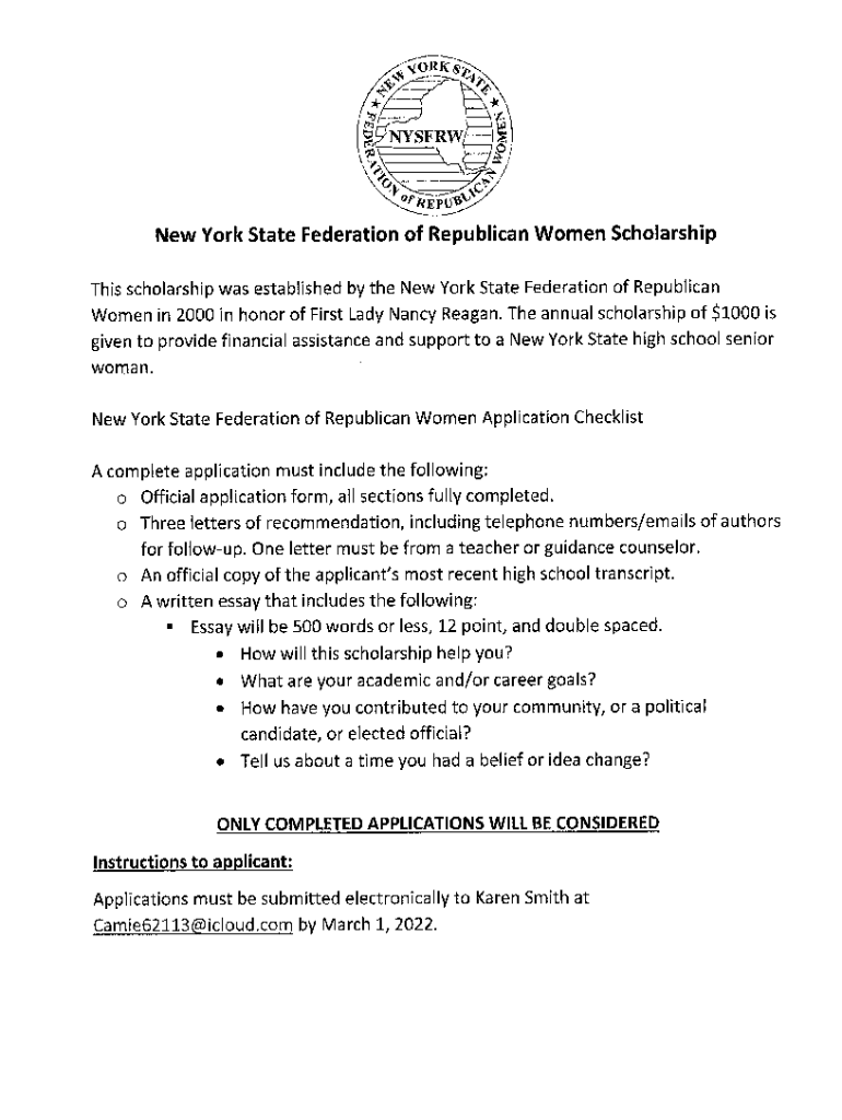 New York State Federation of Republican Women Scholarship This scholarship was established by the New York State Federation of Republican Women in 2000 in honor of First Lady Nancy Reagan. The annual