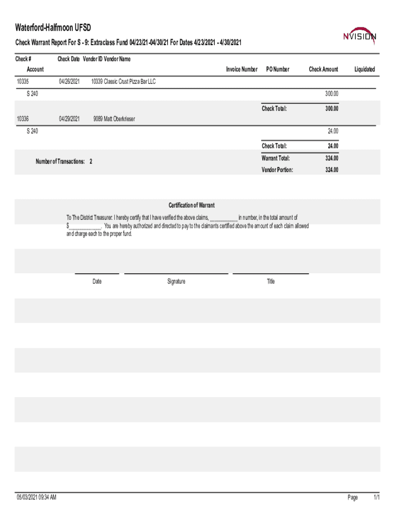 WaterfordHalfmoon FSD Check Warrant Report For S 9: Extra class Fund 04/23/2104/30/21 For Dates 4/23/2021 4/30/2021 Check # Account 10335Check Date Vendor ID Vendor Name Invoice Number 04/26/2021PO