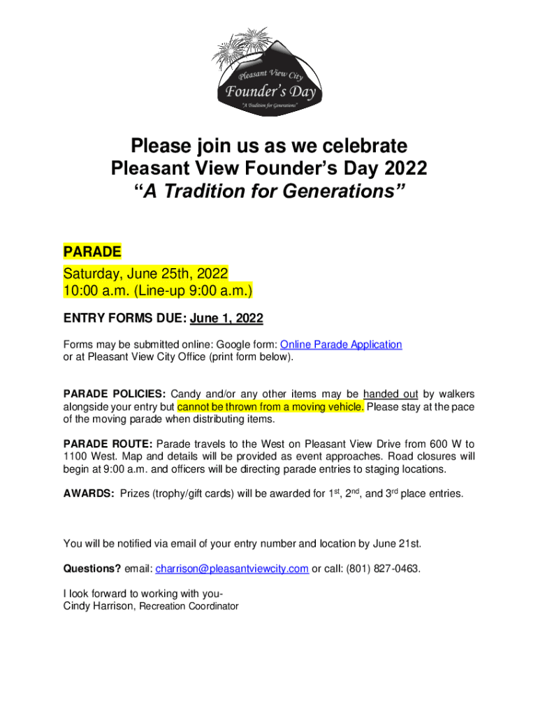Please join us as we celebrate Pleasant View Founders Day 2022 A Tradition for Generations PARADE Saturday, June 25th, 2022 10:00 a.m. (Lineup 9:00 a.m.) ENTRY FORMS DUE: June 1, 2022, Forms may be