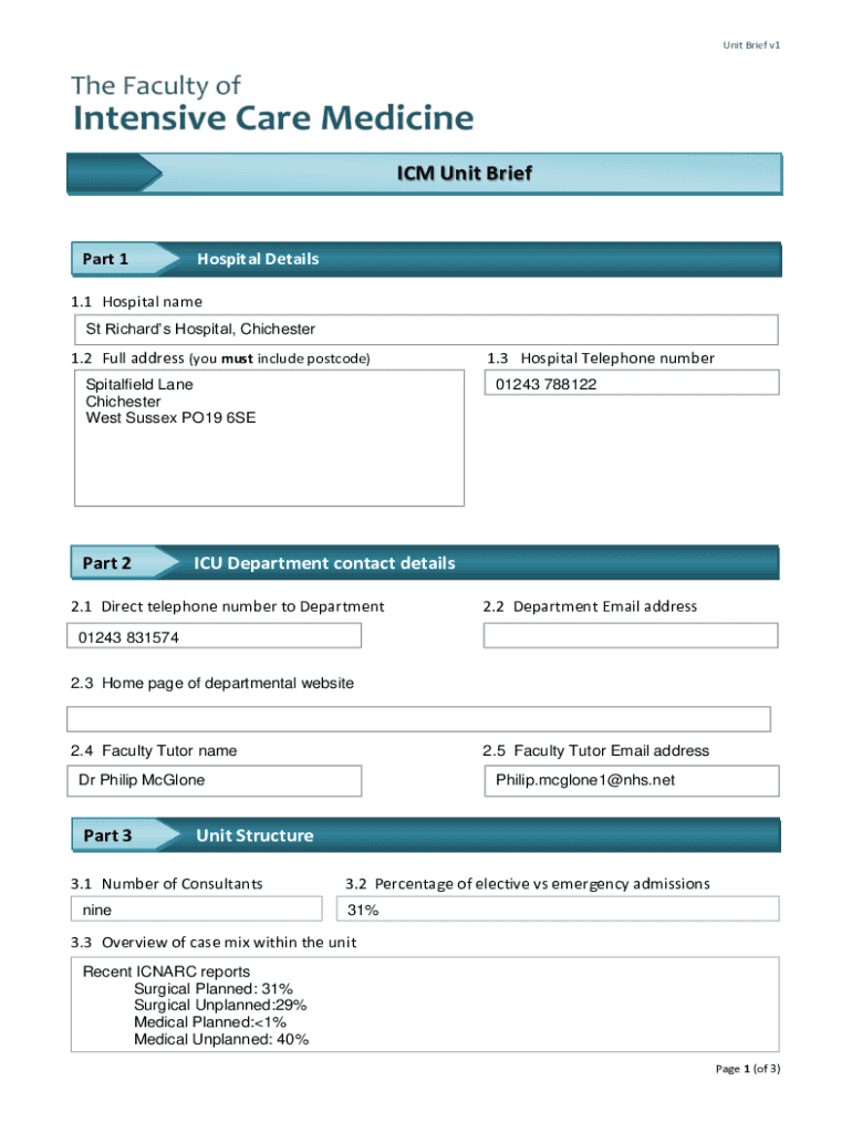 Unit Brief v1ICM Unit Briefcase 1Hospital Details1.1 Hospital name St Richards Hospital, Chichester1.2 Full address (you must include postcode) Pittsfield Lane Colchester West Sussex PO19 6SEPart