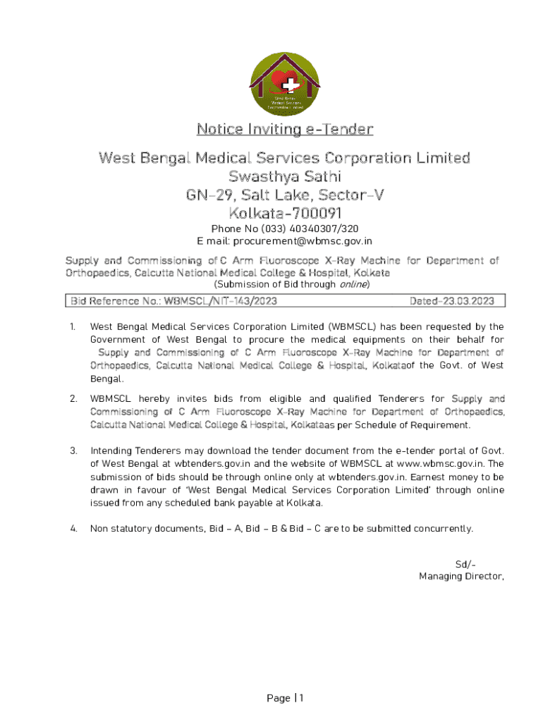 Notice Inviting tender West Bengal Medical Services Corporation Limited Swarthy Sat hi GN GN29, Salt Lake, Sector Kolkata700091 Phone No (033) 40340307/320 E mail: procurement@wbmsc.gov.in Supply