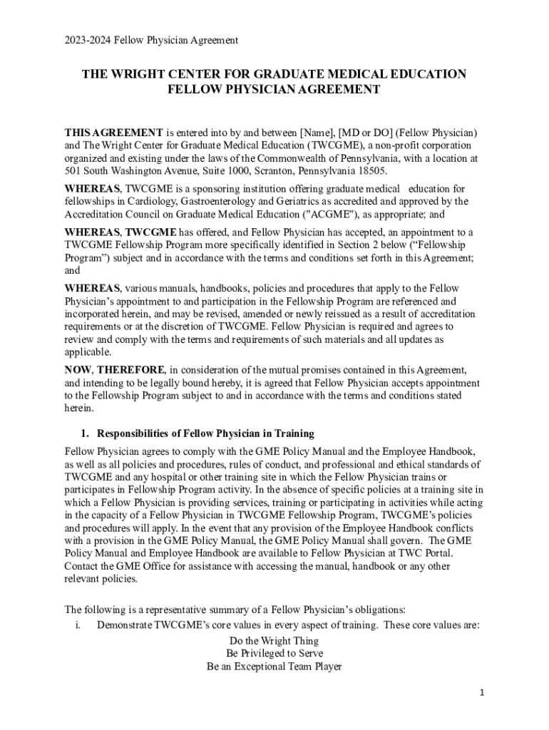 20232024 Fellow Physician Agreement WRIGHT CENTER FOR GRADUATE MEDICAL EDUCATION FELLOW PHYSICIAN AGREEMENT THIS AGREEMENT is entered into by and between [Name], [MD or DO] (Fellow Physician) and