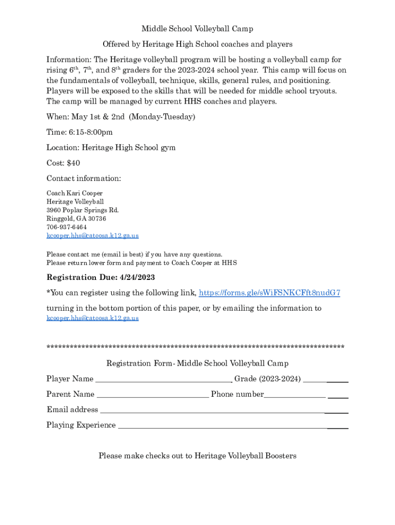 Middle School Volleyball Camp Offered by Heritage High School coaches and players Information: The Heritage volleyball program will be hosting a volleyball camp for rising 6th, 7th, and 8th graders