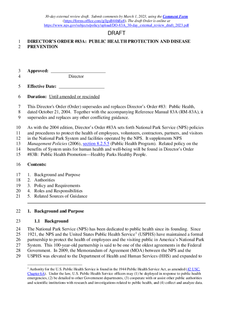 30day external review draft. Submit comments by March 1, 2023, using the Comment Form (https://forms.office.com/g/JguB44hEu8). The draft Order is online at https://www.nps.gov/subjects/policy/upload/DO83A_30day_external_review_draft_2023.pdfDRAFT