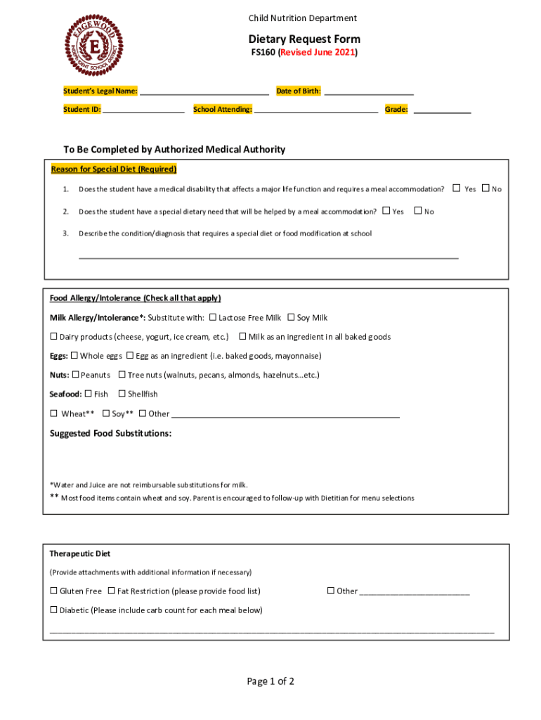 Child Nutrition DepartmentDietary Request Form FS160 (Revised June 2021)Students Legal Name: Student ID:Date of Birth: School Attending:___ Grade:To Be Completed by Authorized Medical Authority Reason