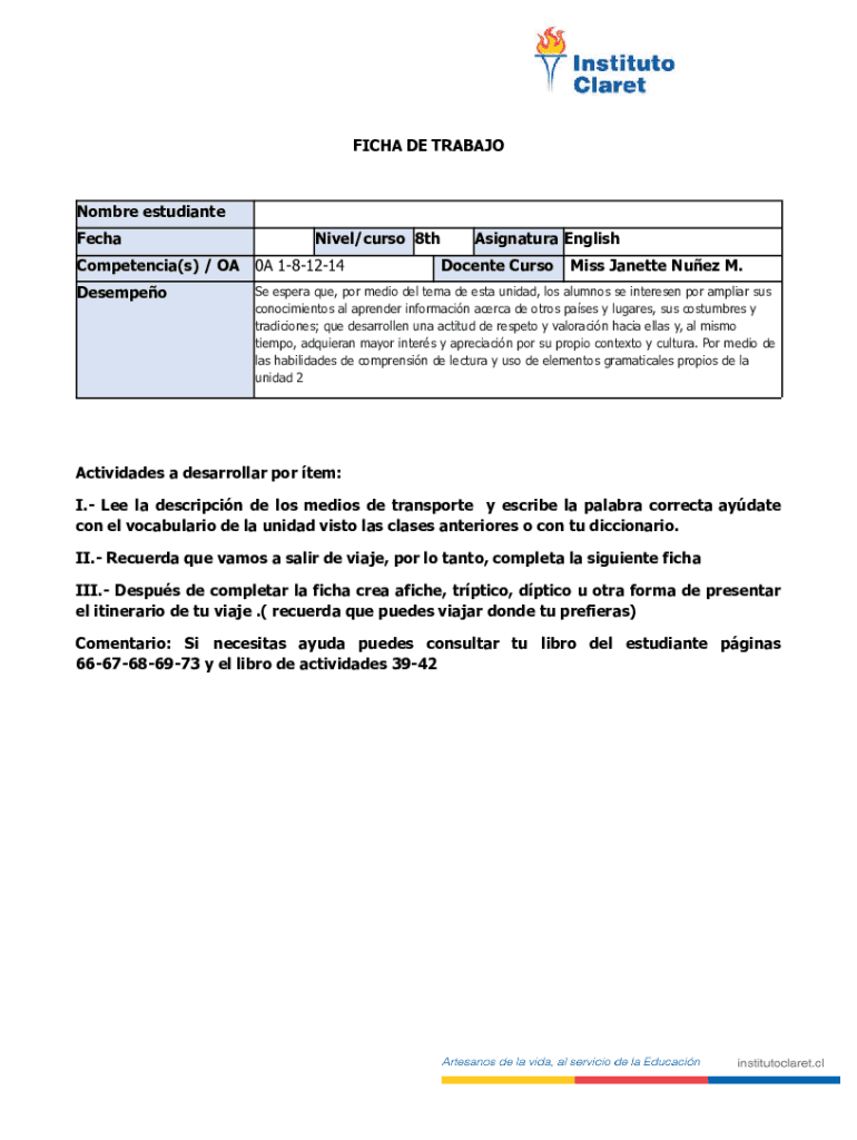 FICA DE TRABAJONombre estudiante Mechanical/curse 8thAsignatura EnglishCompetencia(s) / OA0A 181214Docente Cursors Janette Suez M. Decompose esp era Que, POR media Del team de ESTA unidad, Los alumnus