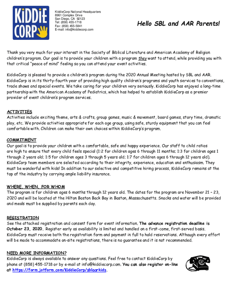 Kiddie Corp National Headquarters 8961 Complex Drive San Diego, CA 92123 Tel: (858) 4551718 Fax: (858) 4555841 Email: info@kiddiecorp.comHello SL and AAR Parents! Thank you very much for your interest