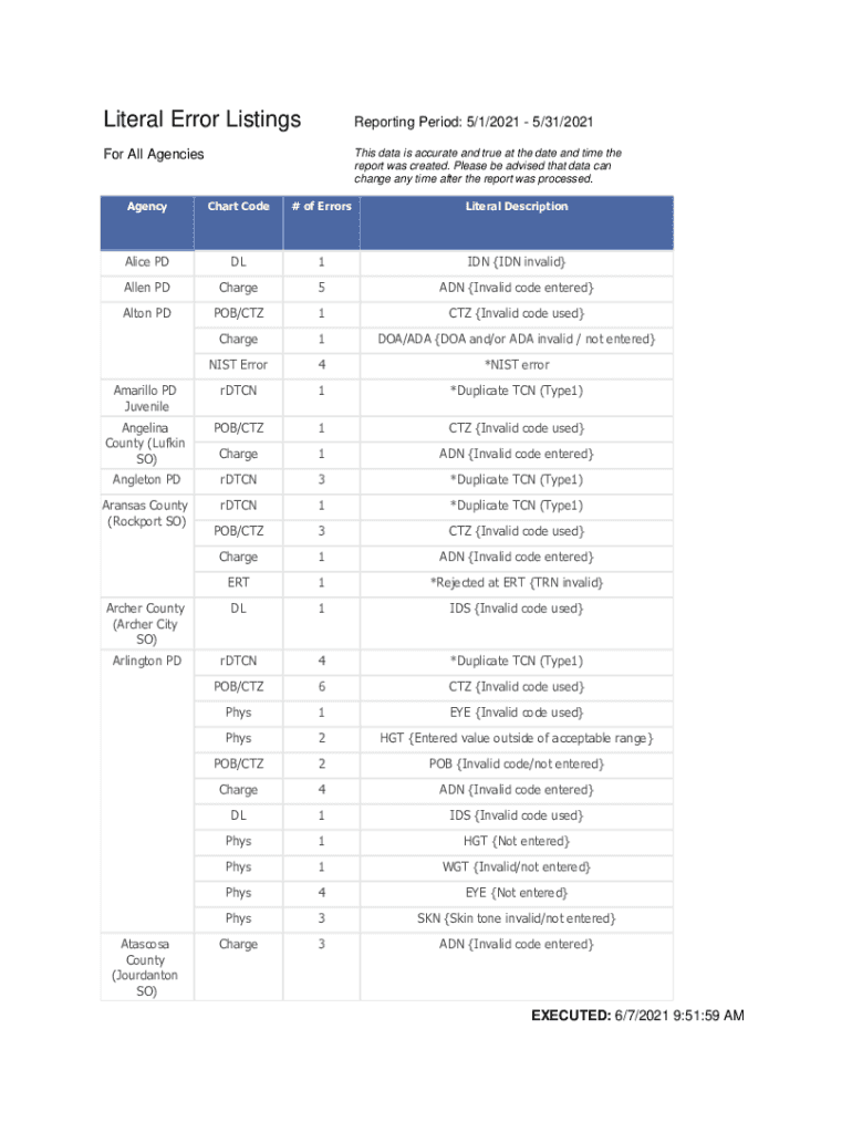 Literal Error ListingsReporting Period: 5/1/2021 5/31/2021 This data is accurate and true at the date and time the report was created. Please be advised that data can change any time after the report