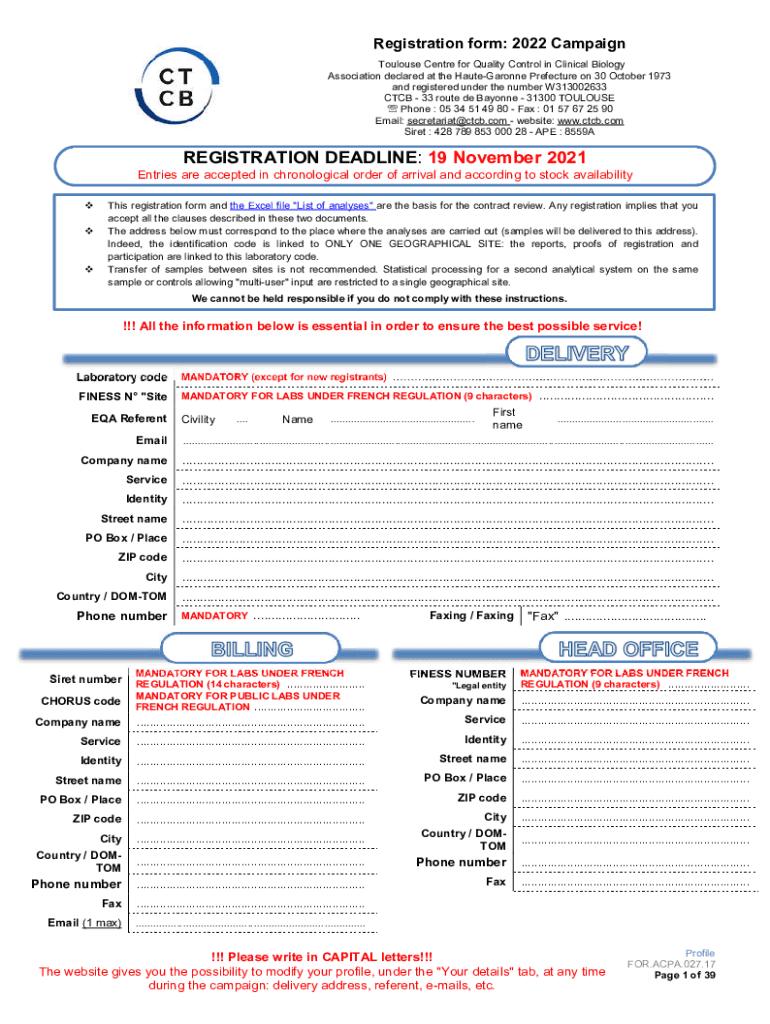 Registration form: 2022 Campaign Toulouse Center for Quality Control in Clinical Biology Association declared at the Haute-Garonne Prefecture on 30 October 1973 and registered under the number W313002633