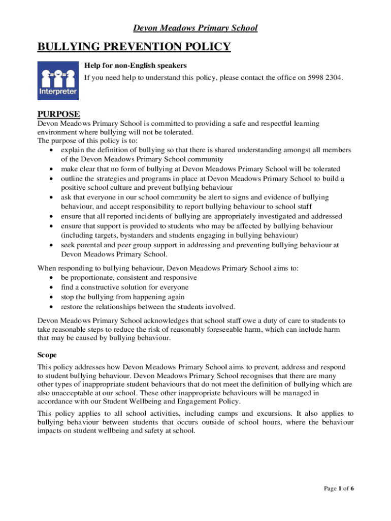 Devon Meadows Primary SchoolBULLYING PREVENTION POLICY Help for non-English speakers If you need help to understand this policy, please contact the office on 5998 2304.PURPOSE Devon Meadows Primary