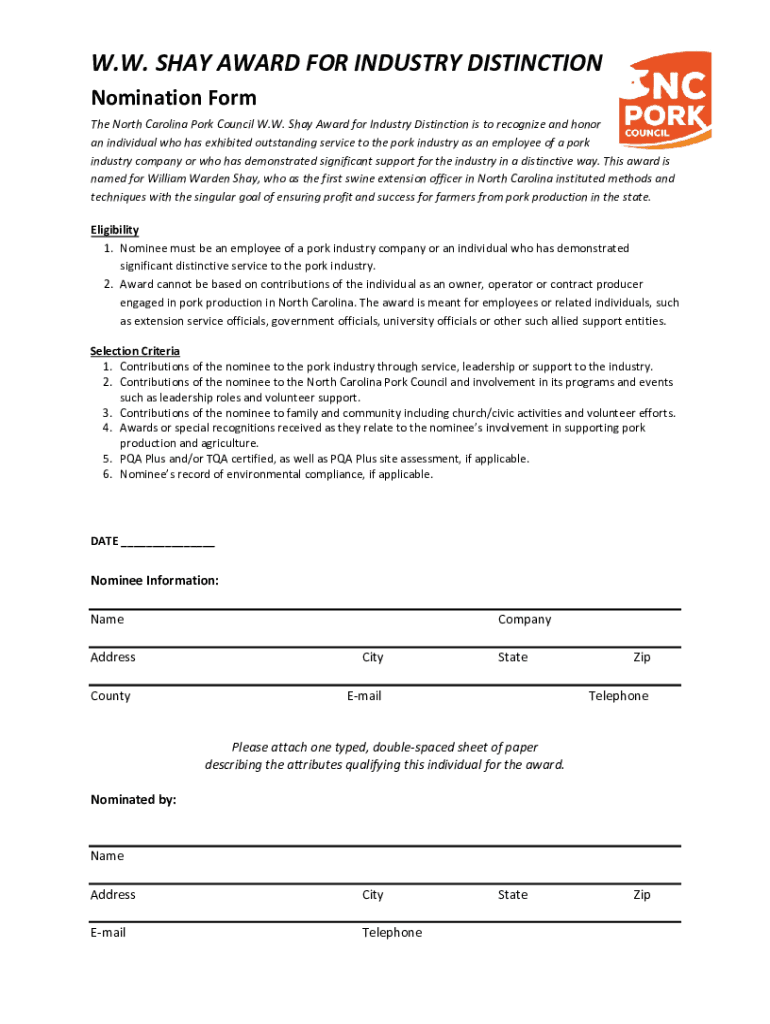 W.W. SHAY AWARD FOR INDUSTRY DISTINCTION Nomination Form The North Carolina Pork Council W.W. Shay Award for Industry Distinction is to recognize and honor an individual who has exhibited outstanding