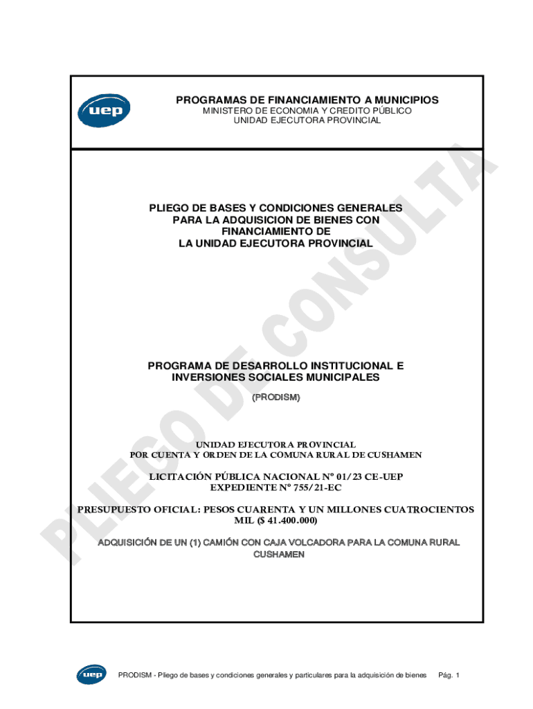 PROGRAMS DE FINANCIAMIENTO A MUNICIPALS MINISTER ODE ECONOMIC Y CREDIT PBL ICO UNITED EXECUTOR PROVINCIALPLIEGO DE BASES Y CONDITIONS GENERALS PARA LA ACQUISITION DE LINES CON FINANCIAMIENTO DE LA