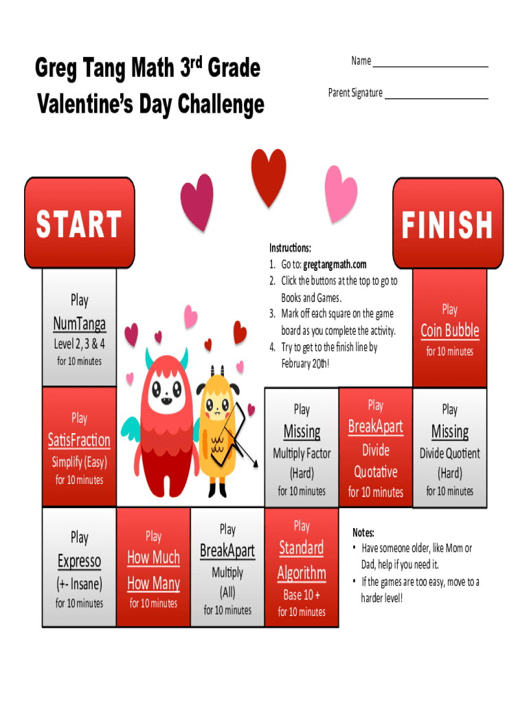Valentine's Day ChallengeSTARTInstruc(ONS:1. Go to: gregtangmath.com2. Click the Burns at the top to go books and Games.3. Mark o each square on the game board as you complete the cavity.4.