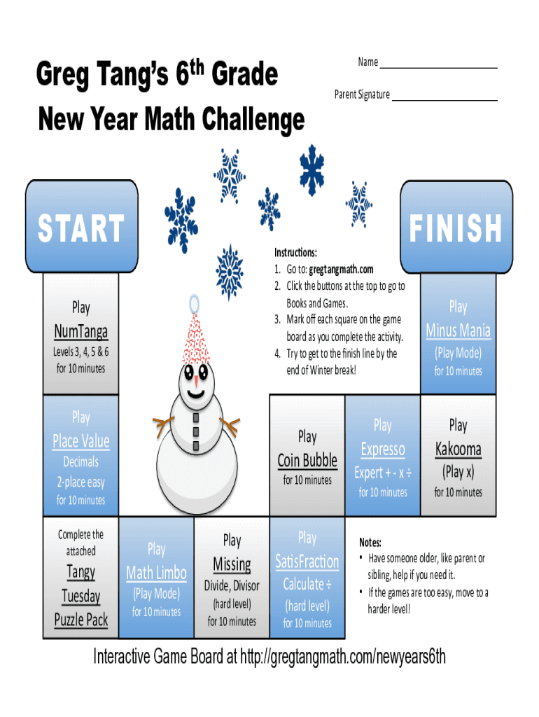Greg Tangs6thGradeNew Year Math ChallengeSTARTName ___Parent Signature ___Instructions:1. Go to: gregtangmath.com2. Click the Burns at the top to go books and Games.3. Mark o each square on the game