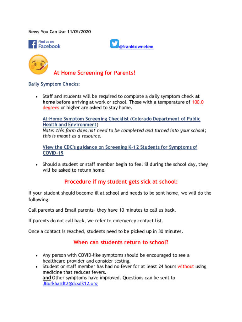 News You Can Use 11/05/2020 @franktownelemAt Home Screening for Parents! Daily Symptom Checks: Staff and students will be required to complete a daily symptom check at home before arriving at work