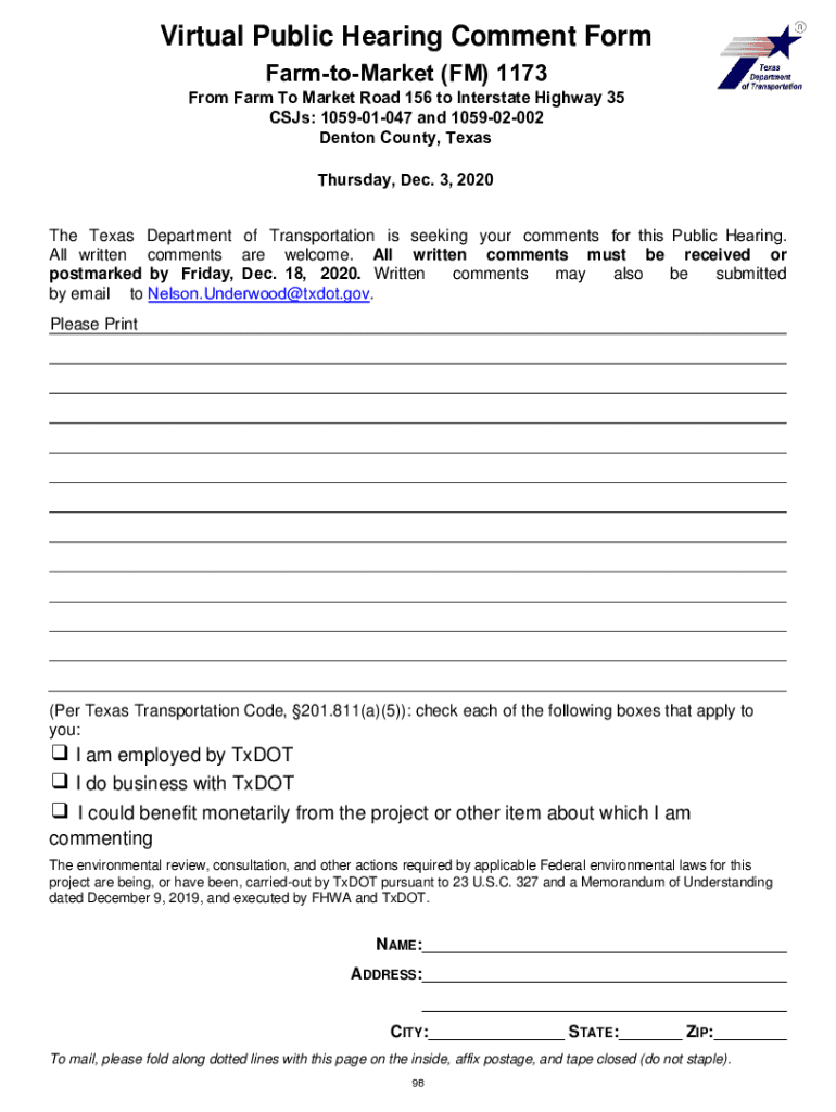 Documentation of Public Hearing Project Location Denton County FarmtoMarket (FM) 1173 CSS: 105901047 and 105902002 Project Limits FarmtoMarket 156 to Interstate Highway 35 Hearing Location Unperson