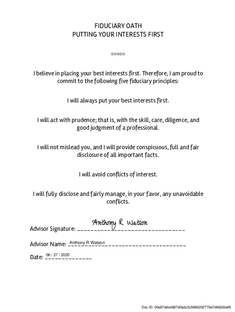 FIDUCIARY OATH PUTTING YOUR INTERESTS FIRST I believe in placing your best interests first. Therefore, I am proud to commit to the following five fiduciary principles: I will always put your best