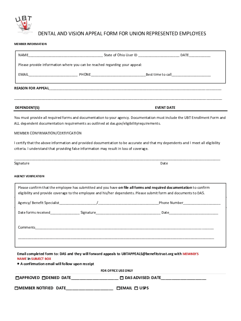 The dental-and-vision-appeal-form-for must include your name, contact information, explanation of the decision being appealed, and any relevant supporting documentation.