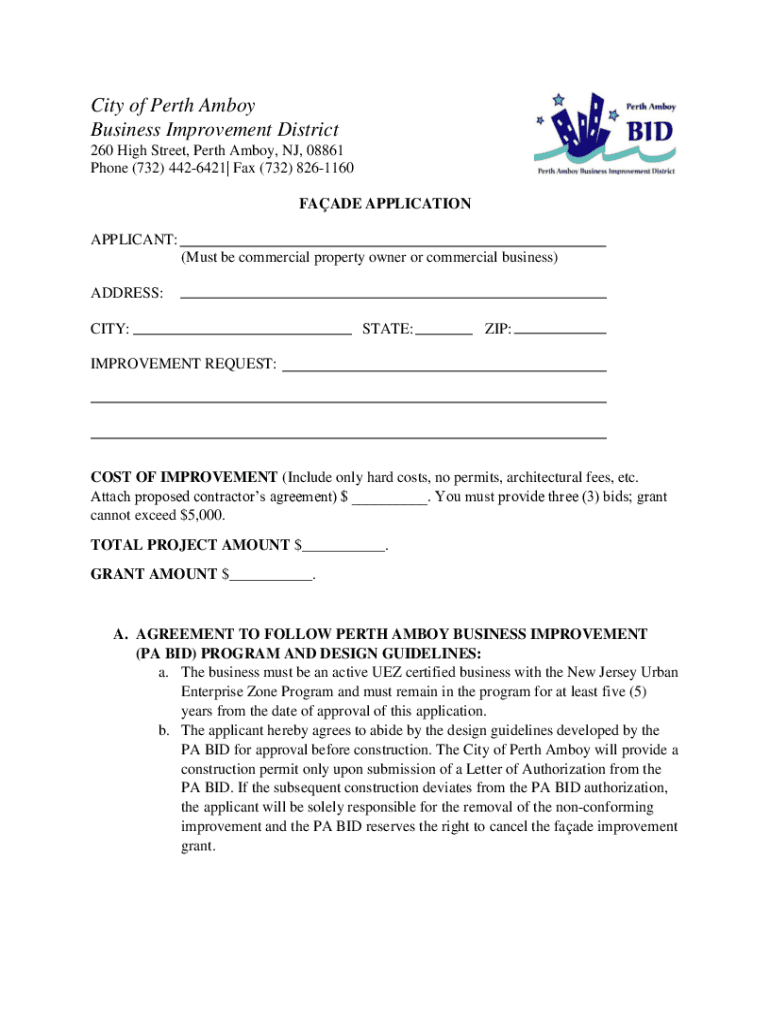 City of Perth Amboy Business Improvement District 260 High Street, Perth Amboy, NJ, 08861 Phone (732) 4426421| Fax (732) 8261160 FACADE APPLICATION APPLICANT: (Must be commercial property owner or