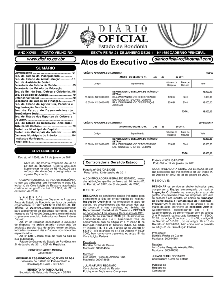 ANO XXVIIIPORTO VELHOROwww. Dion.RO.gov.brSEXTAFEIRA 21 DE JANEIRO DE 2011Atos do Execution 1659 SALERNO PRINCIPALdiariooficialro@hotmail.comSUMRIO