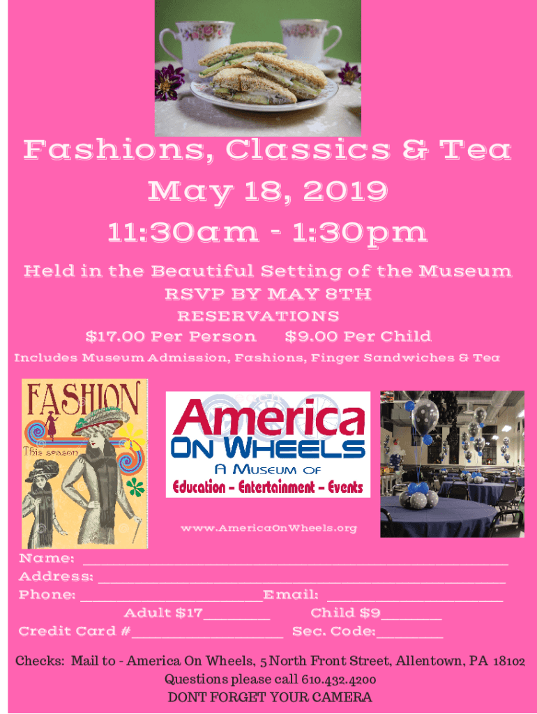 Fashions, Classics & Tea May 18, 2019 11:30am 1:30pm Held in the Beautiful Setting of the Museum RSVP BY MAY 8TH RESERVATIONS $17.00 Per Person $9.00 Per Child Includes Museum Admission, Fashions,