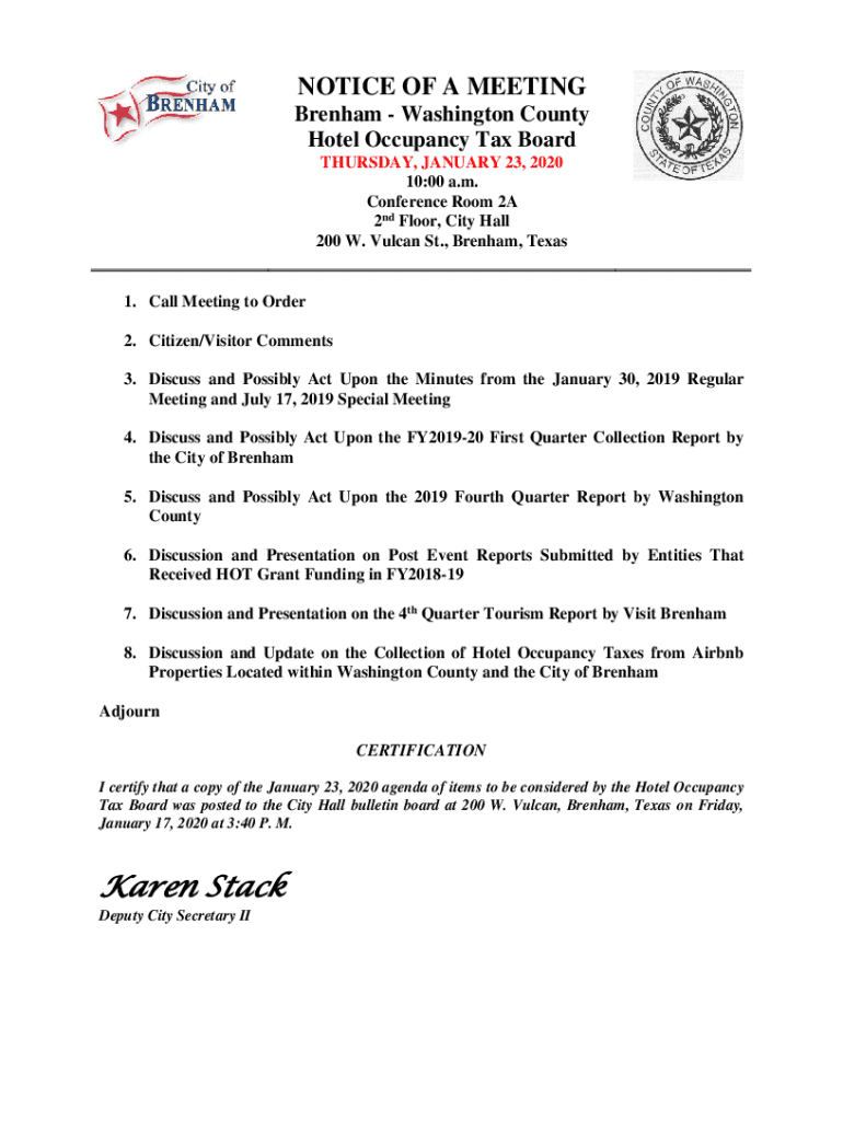 Get the free Brenham - Washington County Hotel Occupancy Tax Board