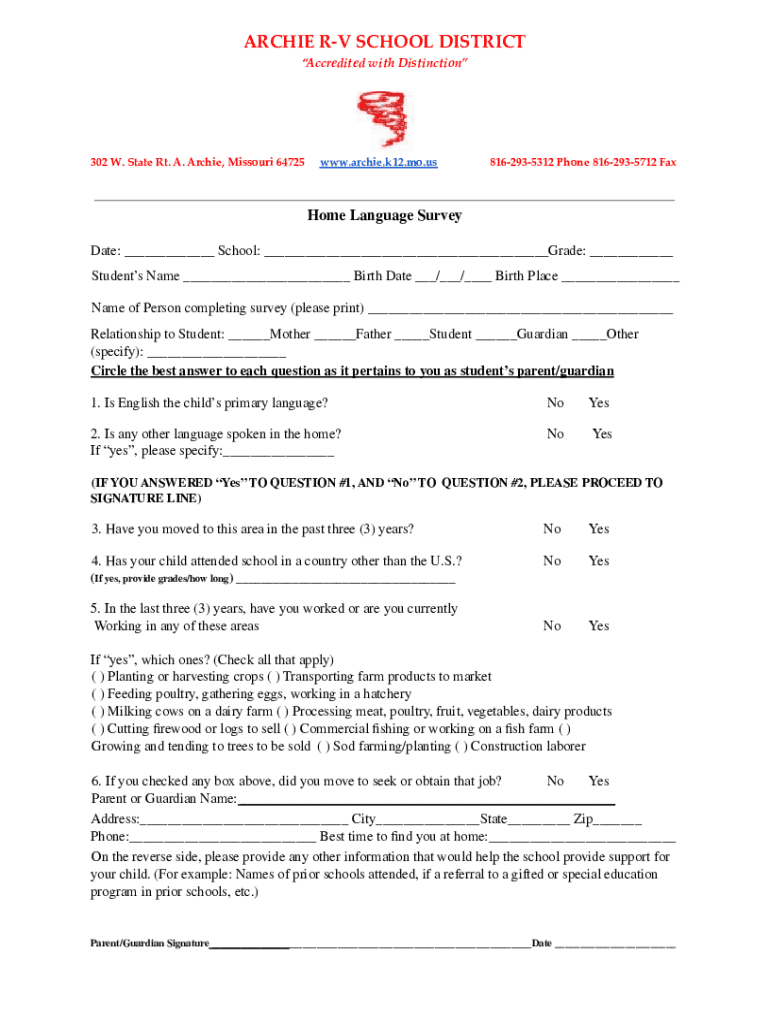 ARCHIE RV SCHOOL DISTRICT Accredited with Distinction302 W. State Rt. A. Archie, Missouri 64725www. Archie.k12.mo.us8162935312 Phone 8162935712 Fathom Language Survey Date: ___ School: ___Grade: ___